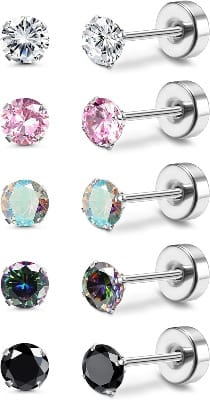 The Milacolato 5 Pairs Titanium Earrings for Women – a stunning and hypoallergenic jewelry set that combines elegance with comfort. This set offers a variety of 5 pairs of exquisite stud earrings, making it a versatile addition to your collection. Comprising one pair of clear cubic zirconia studs and four pairs of rainbow cubic zirconia studs, it caters to diverse tastes.