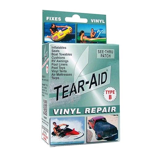For vinyl and vinyl-coated fabrics, including tents, awnings, air mattresses, pool liners, and more, Airhead Tear-Aid's Vinyl Repair Kit provides a dependable fix. Along with a 12" reinforcement filament and two alcohol prep pads for cleaning the repair site, the package comprises a 3" x 12" patch, a 7/8" x 7/8" patch, and a 3/8" x 3/8" patch, depending on the repair required.