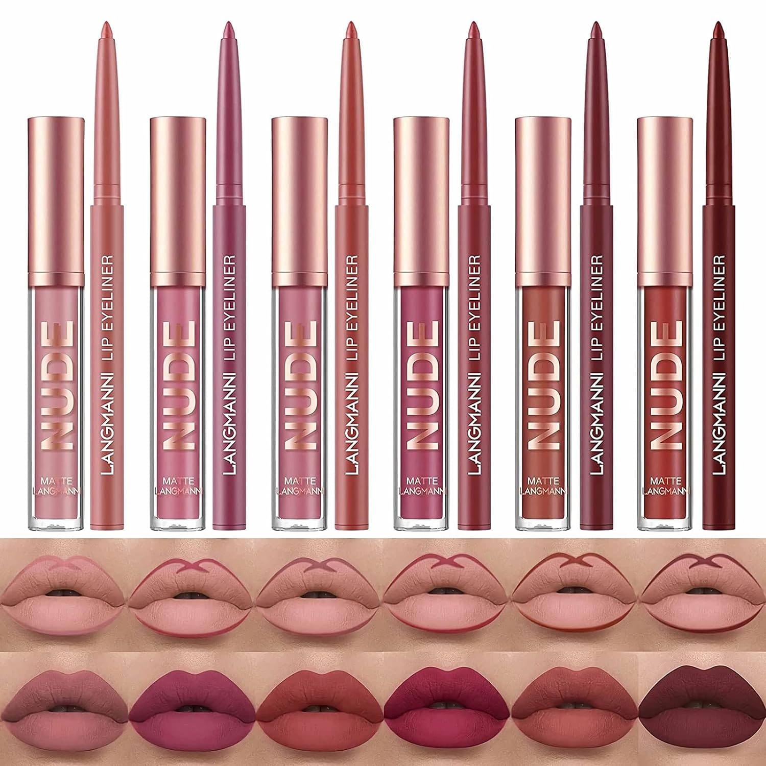 The set has lip liner pencils that help apply precise and thin lines because they have soft and fine tips. The matte lipsticks feel soft and smooth on your lips. They look matte, don't dry out your lips, and stay on for a long time. They are also super waterproof and non-stick, ensuring they do not fade easily or smudge.