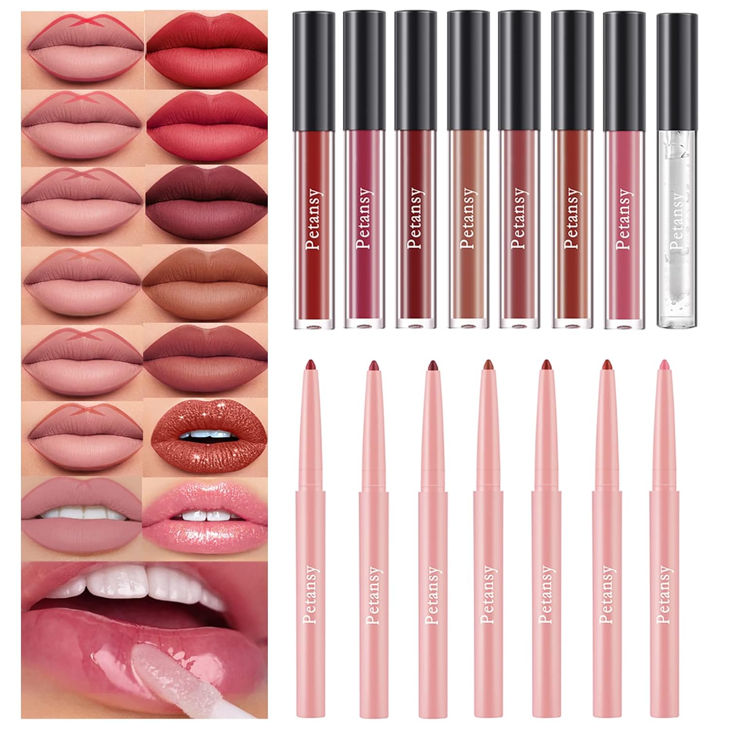The Petansy Lip Liner and Lipstick Set have 15 pieces. It's for girls and women who want different options for their lips. The set has seven lip liners, five liquid matte lipsticks, two matte shimmer lipsticks, and one lip plumper. It gives lots of choices for amazing lip looks.