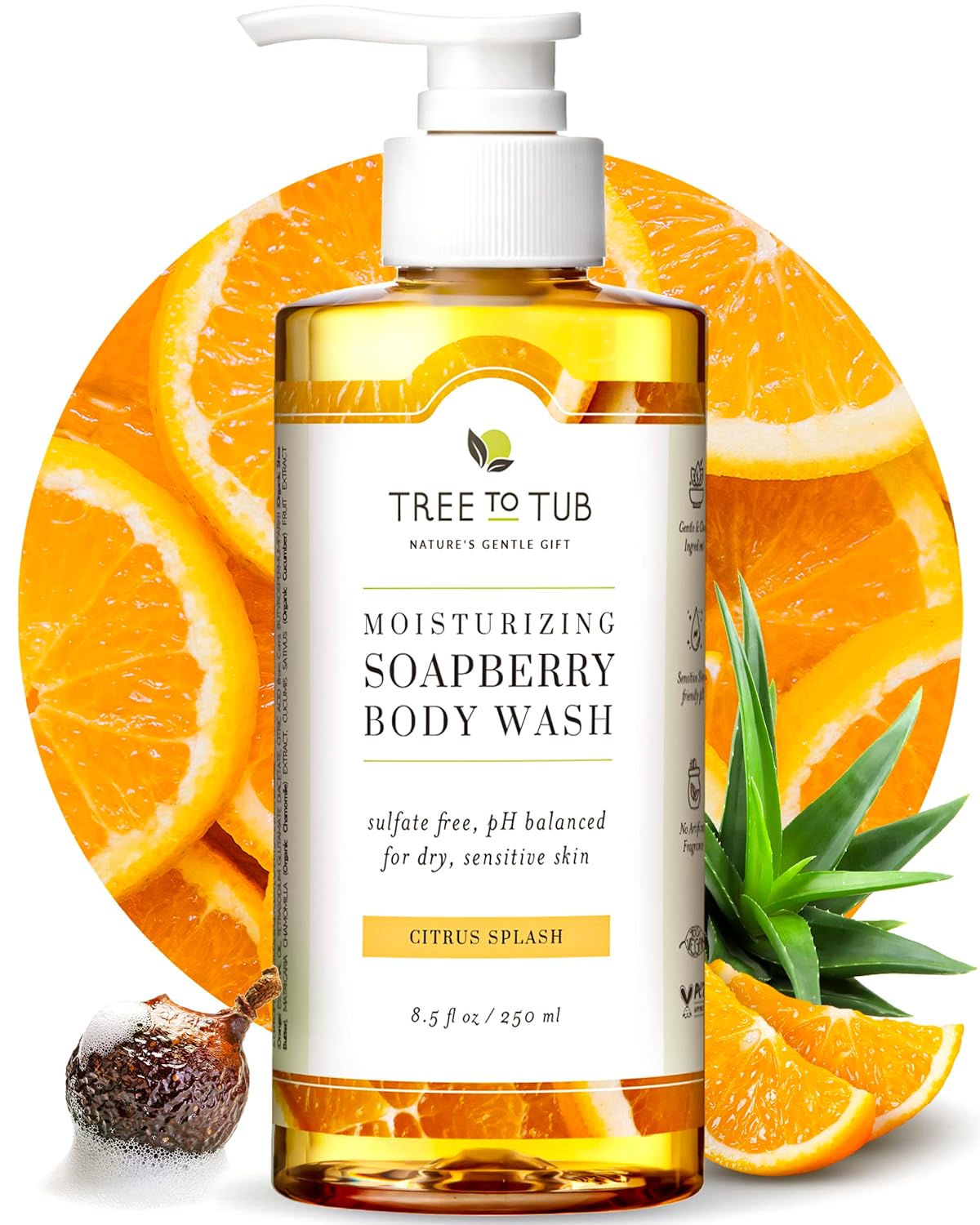 Experience the ultimate in skin care with Tree to Tub Citrus Body Wash. It is specifically designed for dry and sensitive skin. This pH-balanced moisturizing body wash provides a luxurious and hydrating shower experience. It is packed with organic Shea butter, Aloe Vera, and natural Soapberry. This soap is gentle on your skin and won't remove its natural oils because it's sulfate-free.