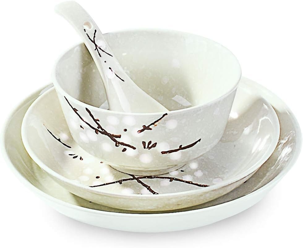 The 4-piece Japanese hand-painted tableware set (White Plum) is a gorgeous complement to any dining collection. It includes plates, a dish, a bowl, a spoon, and a hand-painted table. Each component in this collection, made of fine pottery, radiates endurance and creative flair. The set includes 8" dinner plates, 7" salad plates, 5" bowls, and 5" soup spoons.
