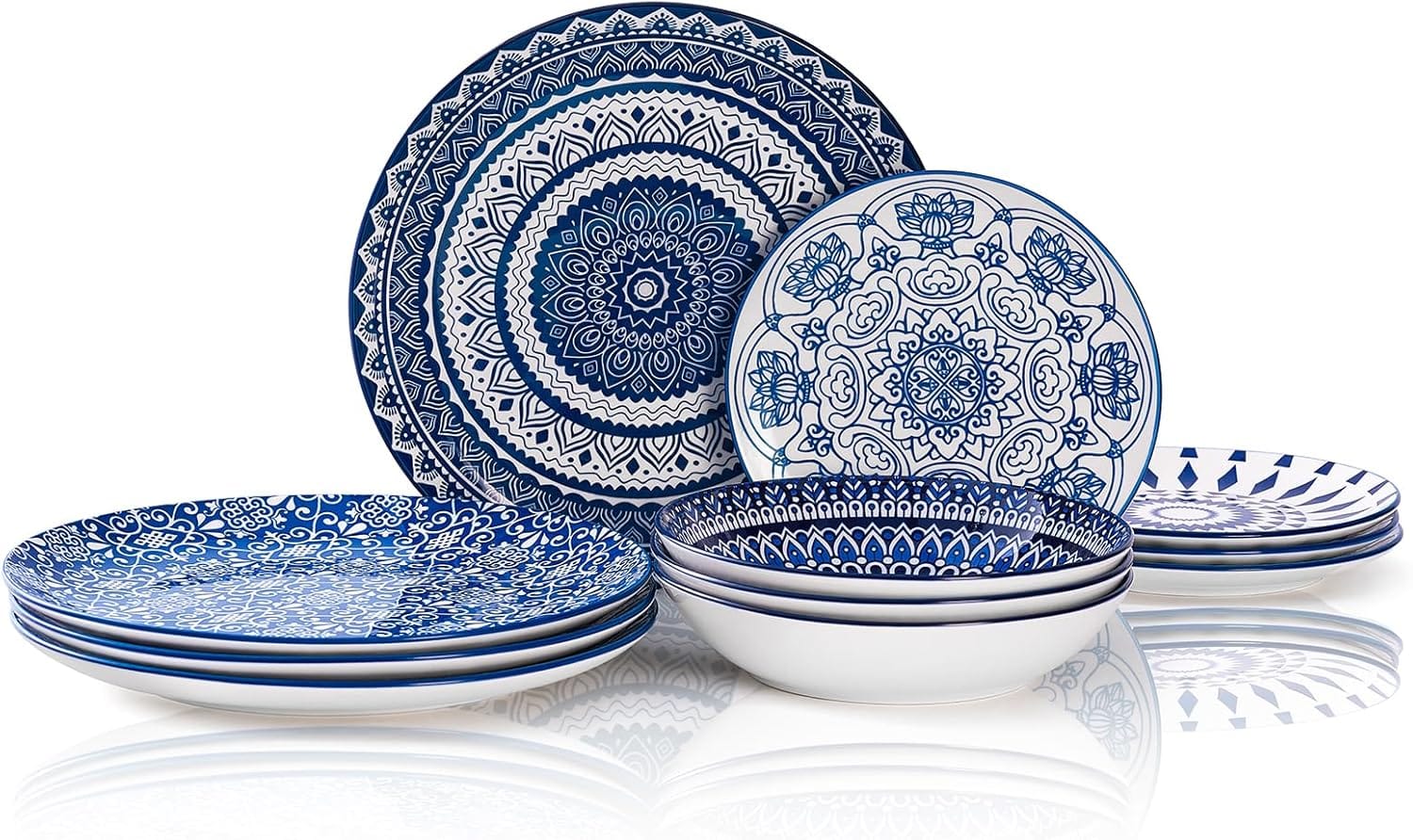 The 12-piece Vintage Blue Ceramic Dinnerware Sets are a chic and adaptable complement to your dining space. This set seats four people with four pieces of 10.5-inch dinner plates, four pieces of 8-inch dessert plates, and four pieces of 7.5-inch bowls. These plates are made of high-quality, non-toxic, lead-free, and chip-resistant porcelain, guaranteeing durability and a secure eating environment.