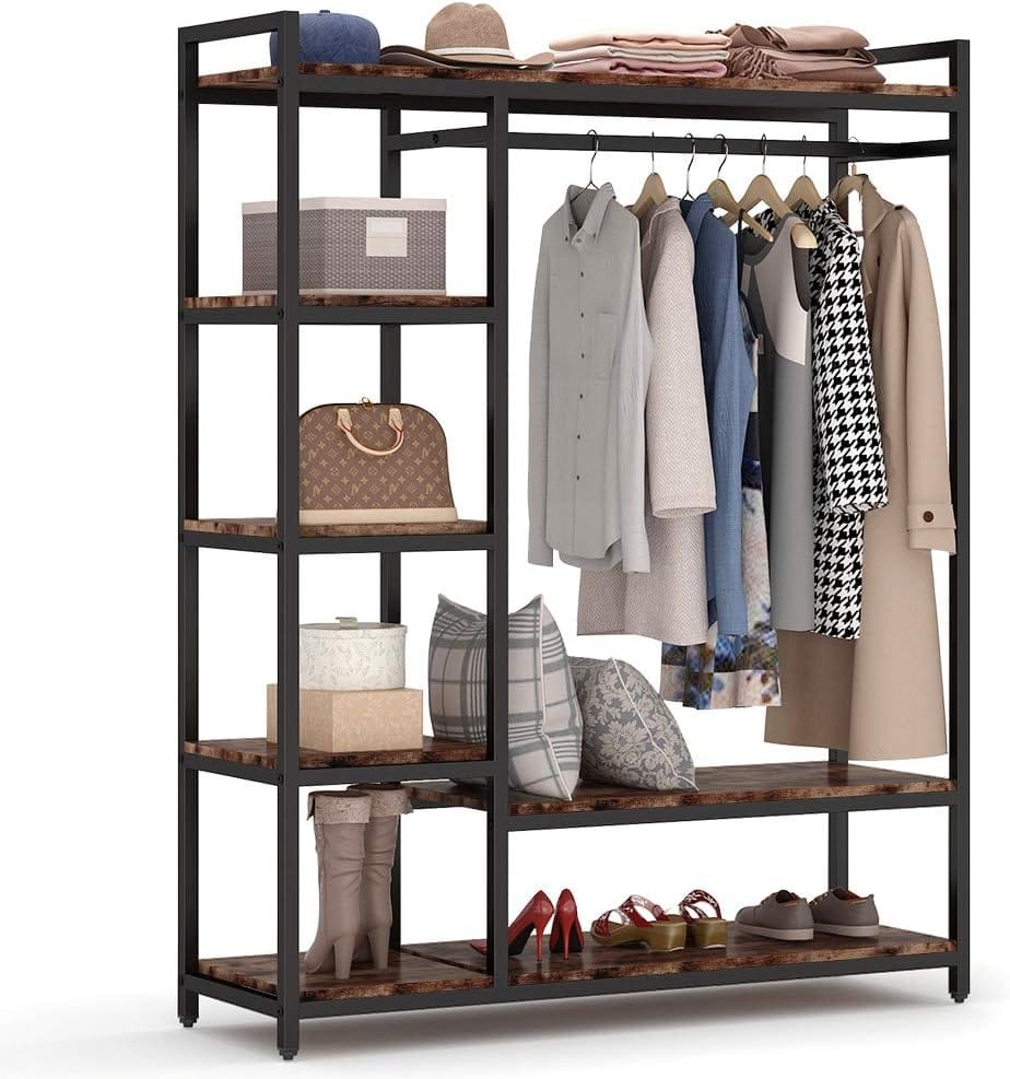 Portable Garment Rack with 6 Shelves and Hanging rod, Black Metal Frame&Rustic Board Finish