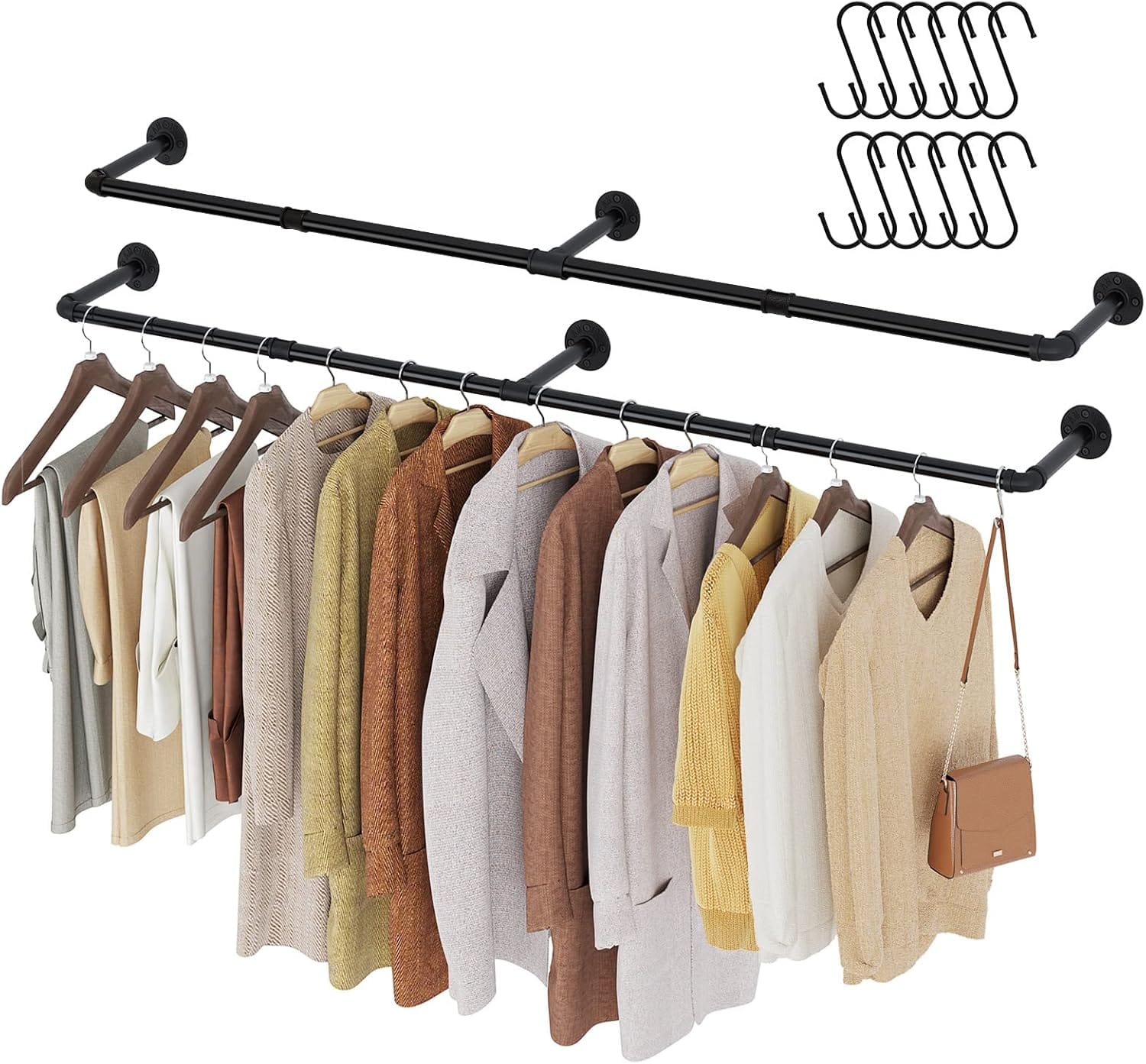 The rack has all the installation hardware needed and three S-shaped hooks ideal for holding bags and other accessories. Its space-saving design allows you to enlarge your closet without taking up any floor space, making it perfect for laundry rooms, bedrooms, entryways, and shopping centers. \